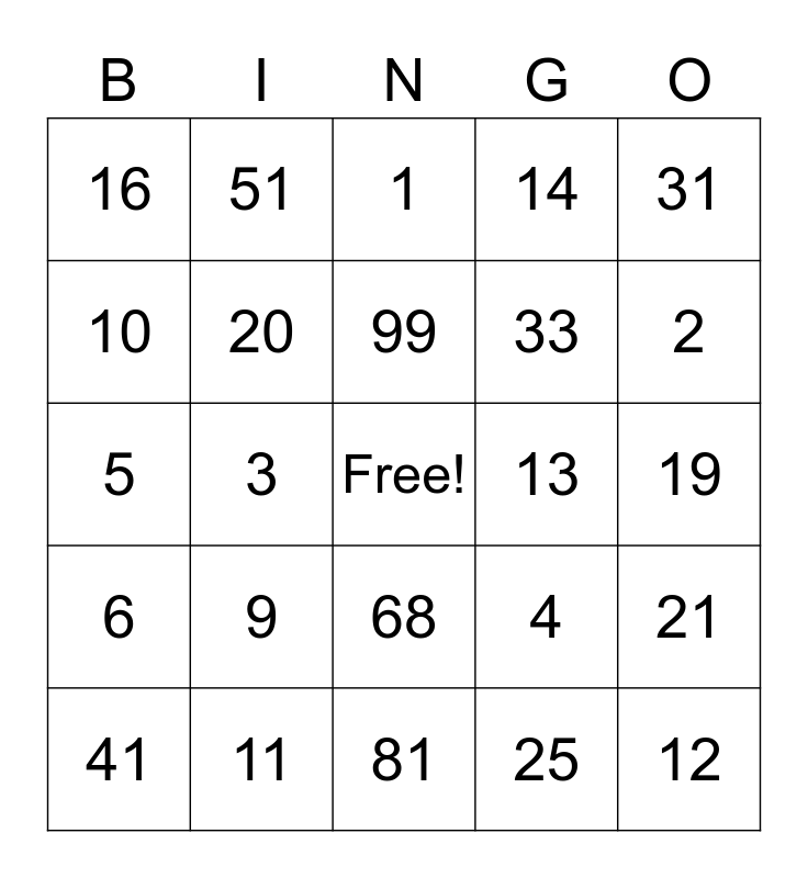 This bingo card has a free space and 29 words: 41, 71, 3, 8, 16, 1, 20, 9, 13, 11, 19, 12, 81, 25, 2, 7, 68, 6, 31, 5, 4, 66, 33, 10, 14, 51, 21, 99 and 22.