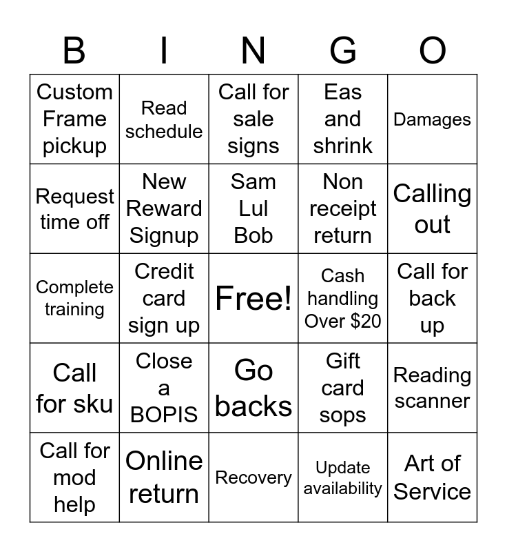 This bingo card has a free space and 24 words: Close a BOPIS, Online return, Sam Lul Bob, Call for mod help, Damages, Custom Frame pickup, Request time off, Read schedule, Cash handling Over $20, Go backs, Non receipt return, Complete training, Gift card sops, Reading scanner, New Reward Signup, Update availability, Call for back up, Call for sale signs, Calling out, Credit card sign up, Art of Service, Call for sku, Eas and shrink and Recovery.