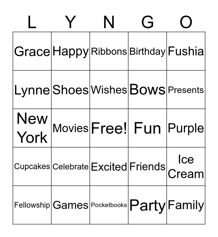 This bingo card has a free space and 24 words: Celebrate, Games, Wishes, Fellowship, Fushia, Grace, Lynne, Happy, Fun, Excited, Bows, New York, Friends, Ice Cream, Shoes, Party, Purple, Ribbons, Presents, Movies, Family, Cupcakes, Birthday and Pocketbooks.