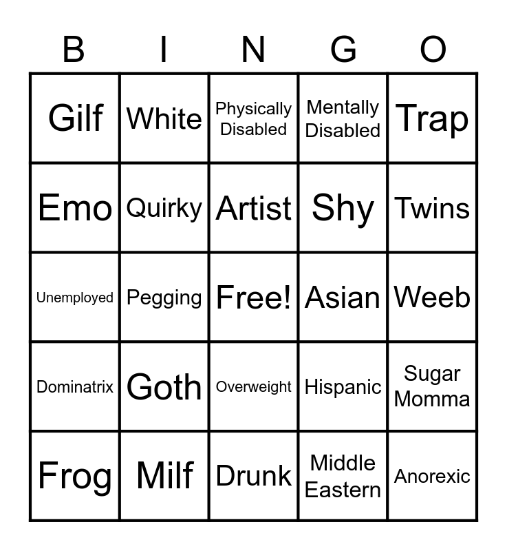 This bingo card has a free space and 24 words: Goth, Milf, Artist, Frog, Trap, Gilf, Emo, White, Asian, Overweight, Shy, Unemployed, Hispanic, Sugar Momma, Quirky, Middle Eastern, Weeb, Physically Disabled, Twins, Pegging, Anorexic, Dominatrix, Mentally Disabled and Drunk.