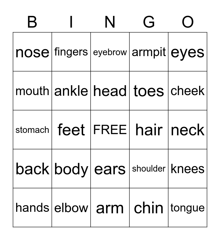 This bingo card has a free space and 25 words: body, arm, head, hands, eyes, nose, mouth, fingers, hair, ears, toes, stomach, shoulder, knees, ankle, wrist, neck, eyebrow, cheek, feet, tongue, elbow, back, armpit and chin.