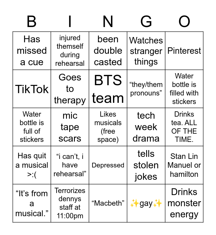 This bingo card has a free space and 24 words: “i can’t, i have rehearsal”, Terrorizes dennys staff at 11:00pm, BTS team, “It’s from a musical.”, Pinterest, Has missed a cue, TikTok, injured themself during rehearsal, tech week drama, Depressed, “they/them pronouns”, Water bottle is full of stickers, tells stolen jokes, Stan Lin Manuel or hamilton, Goes to therapy, ✨gay✨, Drinks tea. ALL OF THE TIME., been double casted, Water bottle is filled with stickers, mic tape scars, Drinks monster energy, Has quit a musical >:(, Watches stranger things and “Macbeth”.