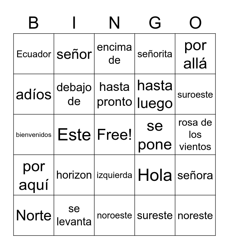 This bingo card has a free space and 29 words: Norte, Sur, Este, Oeste, Ecuador, encima de, debajo de, horizon, se pone, se levanta, rosa de los vientos, noreste, noroeste, sureste, suroeste, derecha, izquierda, por aquí, por allá, bienvenidos, Hola, buenas tardes, hasta luego, adíos, señorita, señor, señora, hasta pronto and nos vemos.