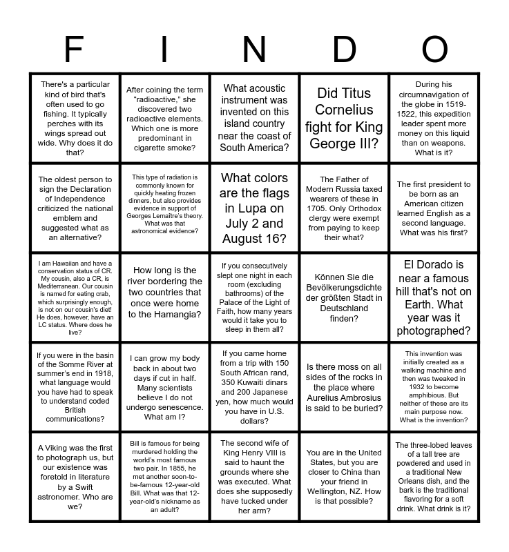 This bingo card has 45 words: Every national flag in the world shares a common geometric characteristic, except for one country. Which country is it?, If you consecutively slept one night in each room (excluding bathrooms) of the Palace of the Light of Faith, how many years would it take you to sleep in them all?, A branch of the U.S. armed forces with the motto "Semper Paratus" runs a training facility in Northern California. Approximately how many people are trained there each year?, A Viking was the first to photograph us, but our existence was foretold in literature by a Swift astronomer. Who are we?, Richard Henderson founded an American colony in 1775. Which current state once contained most of his short-lived colony?, You are in the United States, but you are closer to China than your friend in Wellington, NZ. How is that possible?, What acoustic instrument was invented on this island country near the coast of South America?, The column style used for this Greek temple completed in 438 BCE was borrowed from which ancient civilization?, During his circumnavigation of the globe in 1519-1522, this expedition leader spent more money on this liquid than on weapons. What is it?, Bill is famous for being murdered holding the world’s most famous two pair. In 1855, he met another soon-to-be-famous 12-year-old Bill. What was that 12-year-old’s nickname as an adult?, Did Titus Cornelius fight for King George III?, Können Sie die Bevölkerungsdichte der größten Stadt in Deutschland finden?, If you came home from a trip with 150 South African rand, 350 Kuwaiti dinars and 200 Japanese yen, how much would you have in U.S. dollars?, I can grow my body back in about two days if cut in half. Many scientists believe I do not undergo senescence. What am I?, My route is marked by the shells of scallops, a journey that thousands take each year to a cathedral in my honor, deep in the heart of Galicia. Who am I?, The second wife of King Henry VIII is said to haunt the grounds where she was executed. What does she supposedly have tucked under her arm?, Explorers from Kushiro, Pevek and Namsos arrive at the North Pole and check their watches. If they arrived at 11:42 a.m., 12:17 p.m. and 3 a.m., respectively, which team was first?, I am Hawaiian and have a conservation status of CR. My cousin, also a CR, is Mediterranean. Our cousin is named for eating crab, which surprisingly enough, is not on our cousin's diet! He does, however, have an LC status. Where does he live?, I am the son of a glove maker. In one of my works, five people die by suicide and in another, the title character and 13 others are killed. Who am I?, The first president to be born as an American citizen learned English as a second language. What was his first?, After coining the term “radioactive,” she discovered two radioactive elements. Which one is more predominant in cigarette smoke?, If you stood in the shadow of The High One, you might be on the lookout for the Big Five. What would you be trying to see?, While quietly standing at sea level, you are suddenly whacked on the ankle with a guitar. Did you hear it or feel it first?, There's a particular kind of bird that's often used to go fishing. It typically perches with its wings spread out wide. Why does it do that?, What animal lives in the Yangtze River and is represented by its own rare Xingyiquan form?, El Dorado is near a famous hill that's not on Earth. What year was it photographed?, I am a blue triplet lily that grows from a corm. Some call me a grassnut, but my common name is that of an angel. What is my common name?, If you stacked $20 bills until you reached $1 million, would the stack be higher than the rim of a basketball hoop?, Is there moss on all sides of the rocks in the place where Aurelius Ambrosius is said to be buried?, If you were in the basin of the Somme River at summer’s end in 1918, what language would you have had to speak to understand coded British communications?, Does the Navy have an official Web page that tells the story of the "Ghost Blimp" in World War II?, This invention was initially created as a walking machine and then was tweaked in 1932 to become amphibious. But neither of these are its main purpose now. What is the invention?, In April 1896, I shot and killed a man. Eight months earlier, that man shot and killed a man who 17 years prior was famously reported to have killed 42 men. Who was the man I shot?, Rembrandt painted a philosopher looking at the bust of a Greek poet. The gold medallion on the bust represents another famous Greek. Who is it?, You live next to the Cam. There are approximately 105,594 others just like you. What do other members of your nationality call your people?, How long is the river bordering the two countries that once were home to the Hamangia?, If you were a ferry passenger traveling from Continental Europe to the country with twice as many sheep as people, in what town would you most likely dock?, Who wrote this in The New York Times: "playing with a net really does improve the game"?, The three-lobed leaves of a tall tree are powdered and used in a traditional New Orleans dish, and the bark is the traditional flavoring for a soft drink. What drink is it?, What colors are the flags in Lupa on July 2 and August 16?, The oldest person to sign the Declaration of Independence criticized the national emblem and suggested what as an alternative?, The Father of Modern Russia taxed wearers of these in 1705. Only Orthodox clergy were exempt from paying to keep their what?, If you can’t see my face clearly, you may want to use my invention to evaluate the status of your eyes. Who am I?, This type of radiation is commonly known for quickly heating frozen dinners, but also provides evidence in support of Georges Lemaître’s theory. What was that astronomical evidence? and This member of Lepidoptera increases its weight by 10,000 fold in approximately a fortnight. What is it commonly referred to as?.