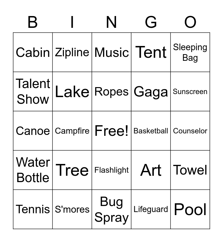 This bingo card has a free space and 24 words: Tree, S'mores, Ropes, Tennis, Sleeping Bag, Cabin, Talent Show, Zipline, Basketball, Flashlight, Gaga, Canoe, Art, Towel, Lake, Lifeguard, Counselor, Music, Sunscreen, Campfire, Pool, Water Bottle, Tent and Bug Spray.