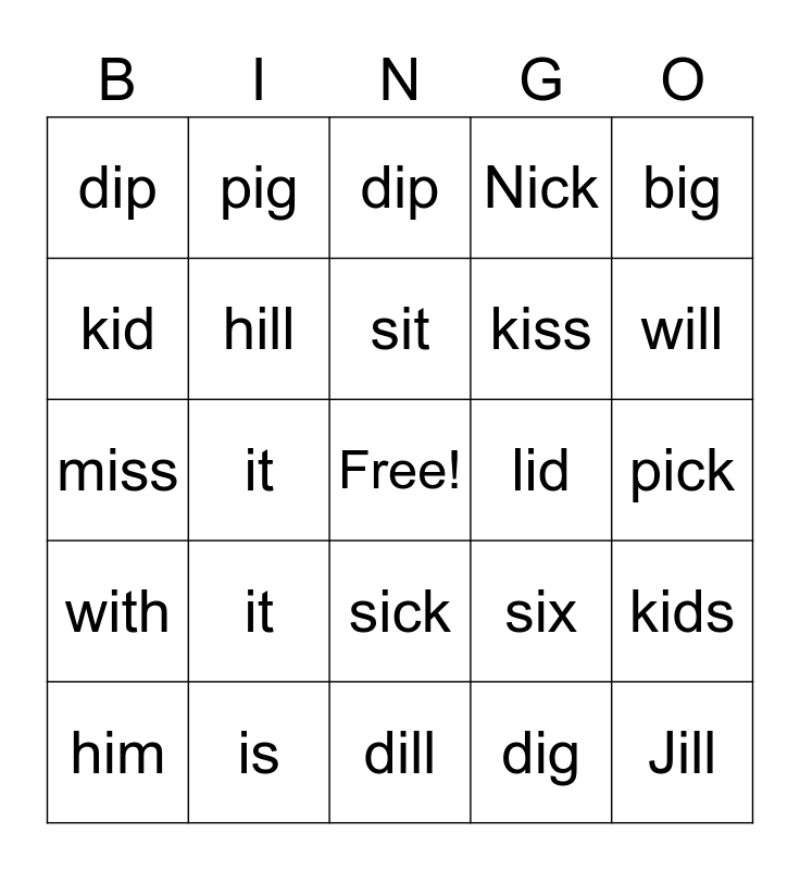 This bingo card has a free space and 24 words: it, is, sit, him, big, dip, kid, pig, lid, sick, kiss, miss, six, kids, hill, dig, pick, dip, will, it, Jill, with, Nick and dill.