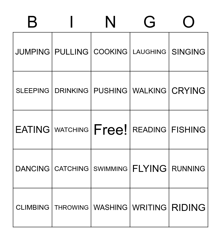 This bingo card has a free space and 24 words: CATCHING, THROWING, PUSHING, CLIMBING, SINGING, JUMPING, SLEEPING, PULLING, READING, SWIMMING, WALKING, EATING, FLYING, RUNNING, DRINKING, WRITING, FISHING, COOKING, CRYING, WATCHING, RIDING, DANCING, LAUGHING and WASHING.