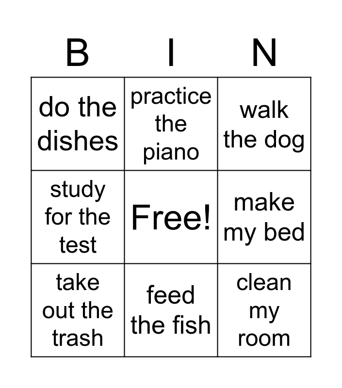 This bingo card has a free space and 8 words: make my bed, walk the dog, practice the piano, take out the trash, do the dishes, clean my room, study for the test and feed the fish.