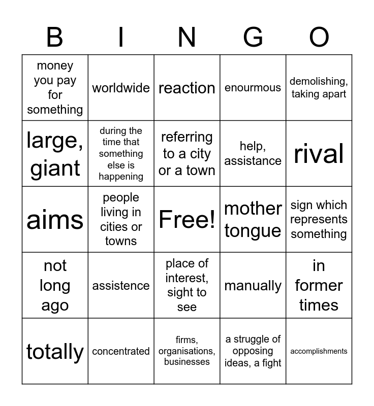 This bingo card has a free space and 27 words: manually, to be successful, help, assistance, firms, organisations, businesses, large, giant, reaction, worldwide, not long ago, mother tongue, in former times, aims, enourmous, totally, concentrated, rival, opportunity, during the time that something else is happening, referring to a city or a town, assistence, money you pay for something, sign which represents something, a struggle of opposing ideas, a fight, people living in cities or towns, accomplishments, place of interest, sight to see, demolishing, taking apart and anticipated, thought it would happen.
