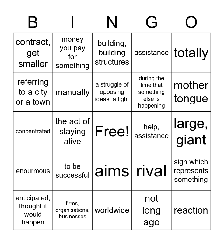 This bingo card has a free space and 29 words: anticipated, thought it would happen, falling apart, the act of staying alive, stop from happening, contract, get smaller, building, building structures, manually, to be successful, help, assistance, firms, organisations, businesses, large, giant, reaction, worldwide, not long ago, mother tongue, in former times, aims, enourmous, totally, concentrated, rival, opportunity, during the time that something else is happening, referring to a city or a town, assistance, money you pay for something, sign which represents something, a struggle of opposing ideas, a fight and people living in cities or towns.
