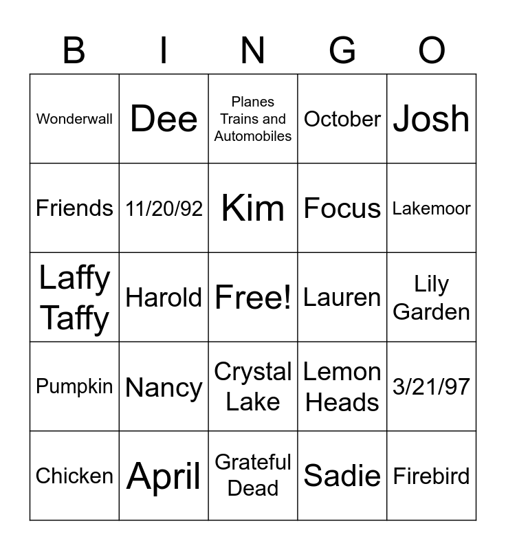 This bingo card has a free space and 24 words: Nancy, April, Kim, Chicken, Josh, Wonderwall, Friends, Dee, Lauren, Crystal Lake, Focus, Laffy Taffy, Lemon Heads, 3/21/97, 11/20/92, Sadie, Lily Garden, Planes Trains and Automobiles, Lakemoor, Harold, Firebird, Pumpkin, October and Grateful Dead.