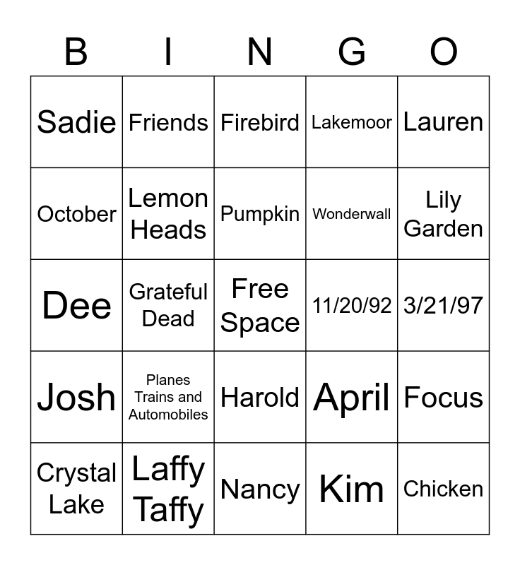 This bingo card has a free space and 24 words: Planes Trains and Automobiles, Laffy Taffy, Pumpkin, Crystal Lake, Lauren, Sadie, October, Friends, 11/20/92, Harold, Wonderwall, Dee, April, Focus, Lemon Heads, Kim, 3/21/97, Firebird, Lily Garden, Grateful Dead, Chicken, Josh, Lakemoor and Nancy.