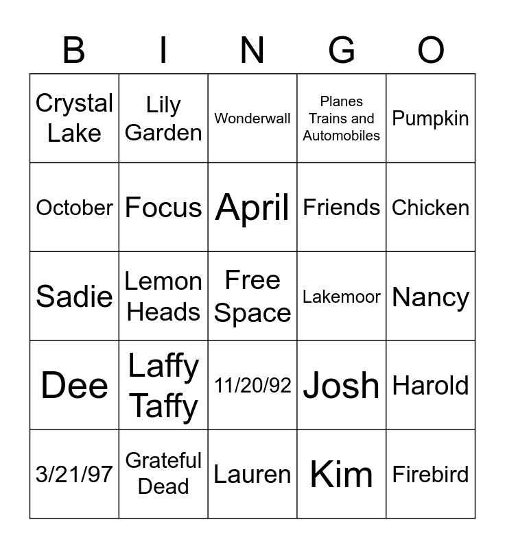 This bingo card has a free space and 24 words: Laffy Taffy, Grateful Dead, April, 3/21/97, Pumpkin, Crystal Lake, October, Lily Garden, Lakemoor, 11/20/92, Friends, Sadie, Josh, Harold, Focus, Kim, Nancy, Wonderwall, Chicken, Lemon Heads, Firebird, Dee, Planes Trains and Automobiles and Lauren.