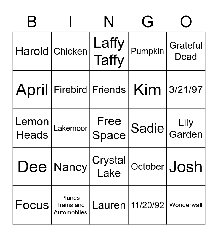 This bingo card has a free space and 24 words: Nancy, Planes Trains and Automobiles, Friends, Focus, Grateful Dead, Harold, April, Chicken, Sadie, Crystal Lake, Kim, Lemon Heads, October, Josh, Firebird, 11/20/92, Lily Garden, Laffy Taffy, 3/21/97, Lakemoor, Wonderwall, Dee, Pumpkin and Lauren.