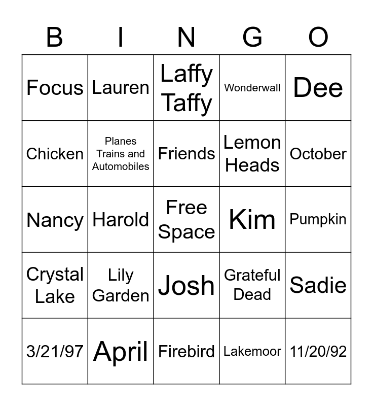 This bingo card has a free space and 24 words: Lily Garden, April, Friends, 3/21/97, Dee, Focus, Chicken, Lauren, Kim, Josh, Lemon Heads, Nancy, Grateful Dead, Sadie, Planes Trains and Automobiles, Lakemoor, Pumpkin, Laffy Taffy, October, Harold, 11/20/92, Crystal Lake, Wonderwall and Firebird.