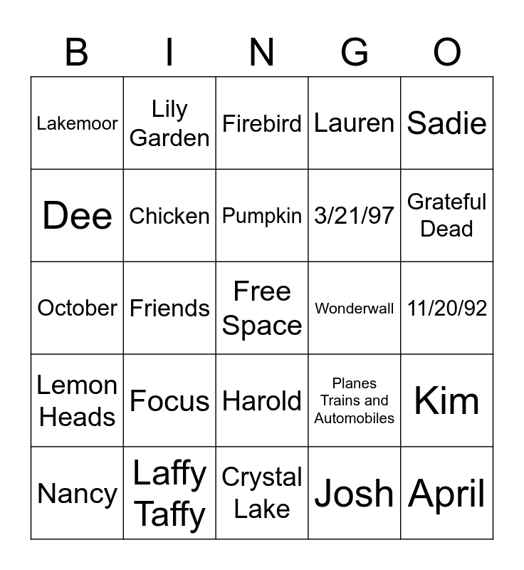 This bingo card has a free space and 24 words: Focus, Laffy Taffy, Pumpkin, Nancy, Sadie, Lakemoor, Dee, Lily Garden, Wonderwall, Harold, 3/21/97, October, Planes Trains and Automobiles, Kim, Chicken, Josh, 11/20/92, Firebird, Grateful Dead, Friends, April, Lemon Heads, Lauren and Crystal Lake.