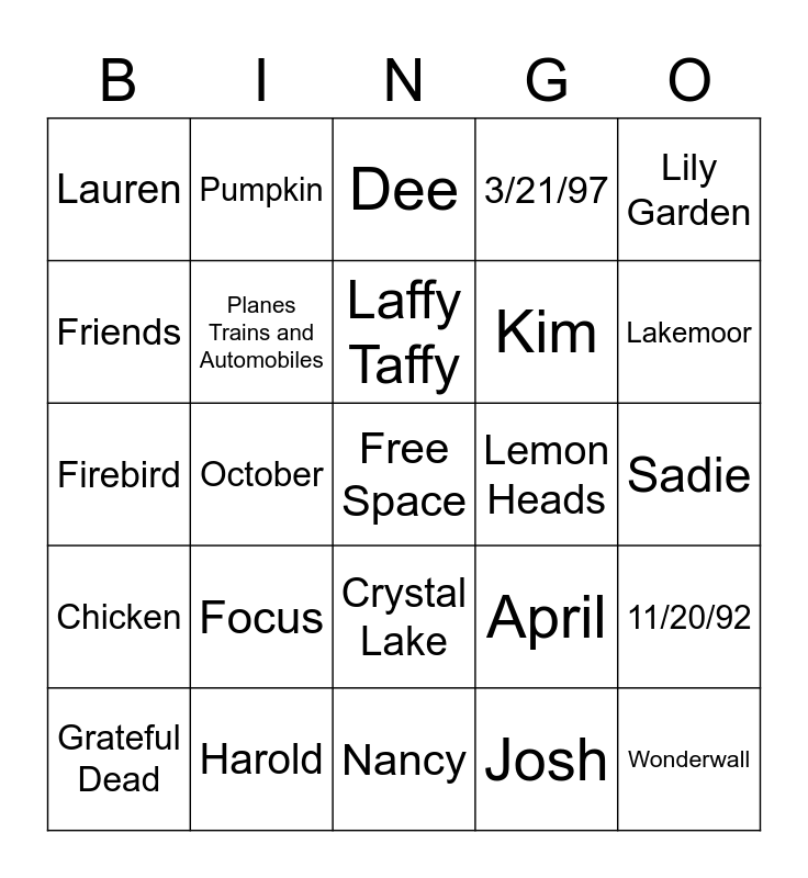 This bingo card has a free space and 24 words: Focus, Harold, Laffy Taffy, Grateful Dead, Lily Garden, Lauren, Friends, Pumpkin, Lemon Heads, Crystal Lake, Kim, Firebird, April, 11/20/92, Planes Trains and Automobiles, Josh, Sadie, Dee, Lakemoor, October, Wonderwall, Chicken, 3/21/97 and Nancy.