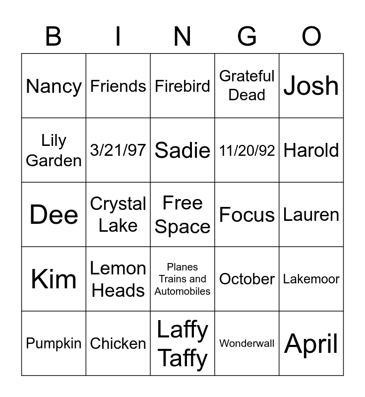 This bingo card has a free space and 24 words: Lemon Heads, Chicken, Sadie, Pumpkin, Josh, Nancy, Lily Garden, Friends, Focus, Planes Trains and Automobiles, 11/20/92, Dee, October, Lakemoor, 3/21/97, Wonderwall, Lauren, Firebird, Harold, Crystal Lake, April, Kim, Grateful Dead and Laffy Taffy.