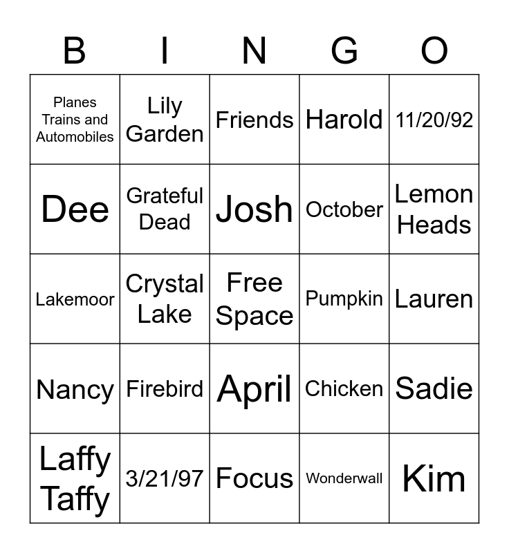 This bingo card has a free space and 24 words: Firebird, 3/21/97, Josh, Laffy Taffy, 11/20/92, Planes Trains and Automobiles, Dee, Lily Garden, Pumpkin, April, October, Lakemoor, Chicken, Sadie, Grateful Dead, Wonderwall, Lauren, Friends, Lemon Heads, Crystal Lake, Kim, Nancy, Harold and Focus.