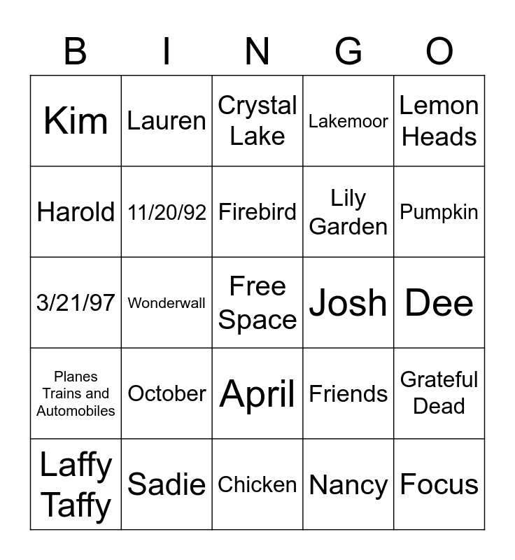 This bingo card has a free space and 24 words: October, Sadie, Firebird, Laffy Taffy, Lemon Heads, Kim, Harold, Lauren, Josh, April, Lily Garden, 3/21/97, Friends, Grateful Dead, 11/20/92, Nancy, Dee, Crystal Lake, Pumpkin, Wonderwall, Focus, Planes Trains and Automobiles, Lakemoor and Chicken.