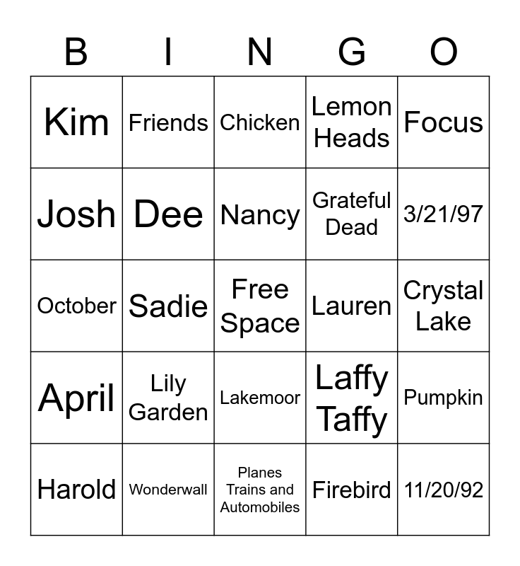 This bingo card has a free space and 24 words: Lily Garden, Wonderwall, Nancy, Harold, Focus, Kim, Josh, Friends, Lauren, Lakemoor, Grateful Dead, October, Laffy Taffy, Pumpkin, Dee, Firebird, Crystal Lake, Chicken, 3/21/97, Sadie, 11/20/92, April, Lemon Heads and Planes Trains and Automobiles.