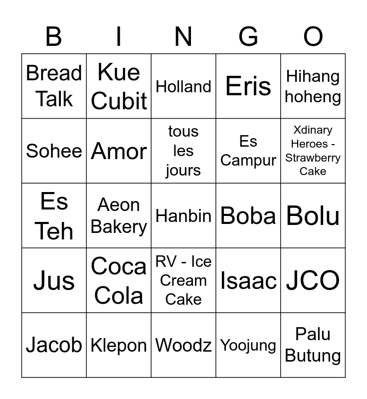 This bingo card has a free space and 24 words: Coca Cola, Klepon, tous les jours, Jacob, Hihang hoheng, Bread Talk, Sohee, Kue Cubit, Boba, RV - Ice Cream Cake, Es Campur, Es Teh, Isaac, JCO, Amor, Yoojung, Bolu, Holland, Xdinary Heroes - Strawberry Cake, Aeon Bakery, Palu Butung, Jus, Eris and Woodz.