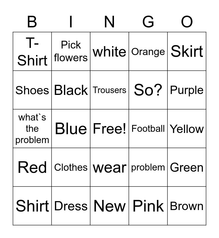 This bingo card has a free space and 24 words: Clothes, Dress, Trousers, Shirt, Skirt, T-Shirt, Shoes, Pick flowers, Football, wear, So?, what`s the problem, problem, Green, Black, Pink, Yellow, white, Purple, Blue, Brown, Red, Orange and New.