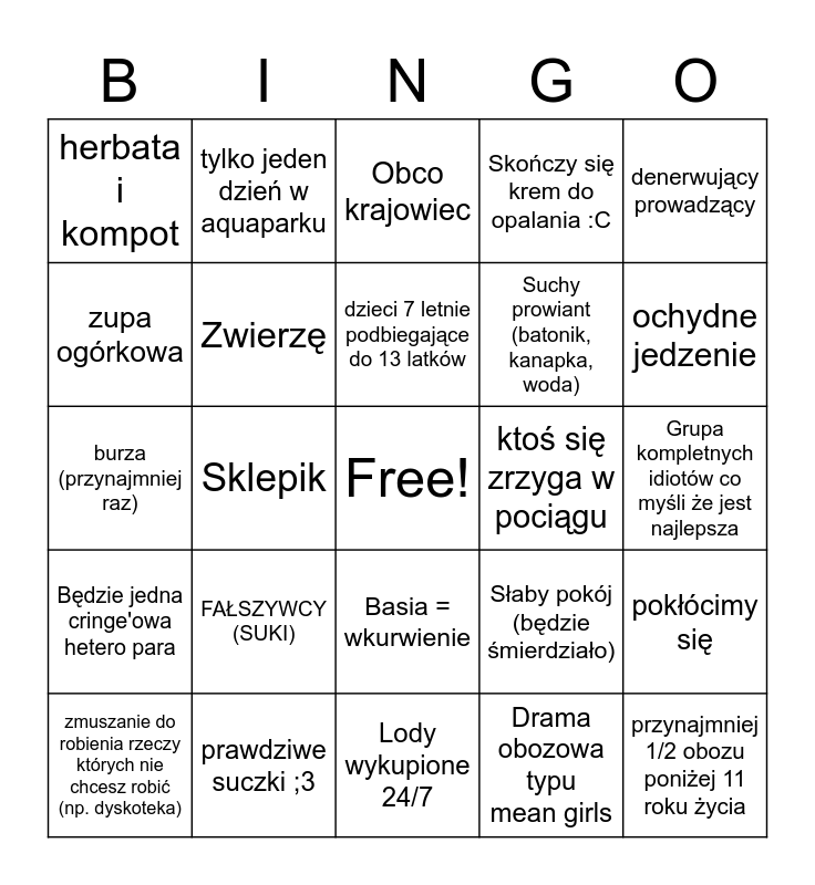 This bingo card has a free space and 24 words: FAŁSZYWCY (SUKI), prawdziwe suczki ;3, dzieci 7 letnie podbiegające do 13 latków, zmuszanie do robienia rzeczy których nie chcesz robić (np. dyskoteka), denerwujący prowadzący, herbata i kompot, zupa ogórkowa, tylko jeden dzień w aquaparku, ktoś się zrzyga w pociągu, Basia = wkurwienie, Suchy prowiant (batonik, kanapka, woda), burza (przynajmniej raz), Słaby pokój (będzie śmierdziało), pokłócimy się, Zwierzę, Drama obozowa typu mean girls, Grupa kompletnych idiotów co myśli że jest najlepsza, Obco krajowiec, ochydne jedzenie, Sklepik, przynajmniej 1/2 obozu poniżej 11 roku życia, Będzie jedna cringe'owa hetero para, Skończy się krem do opalania :C and Lody wykupione 24/7.