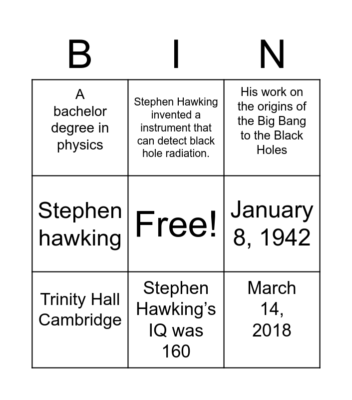 This bingo card has a free space and 8 words: Stephen hawking, Stephen Hawking invented a instrument that can detect black hole radiation., January 8, 1942, Trinity Hall Cambridge, His work on the origins of the Big Bang to the Black Holes, A bachelor degree in physics, Stephen Hawking’s IQ was 160 and March 14, 2018.