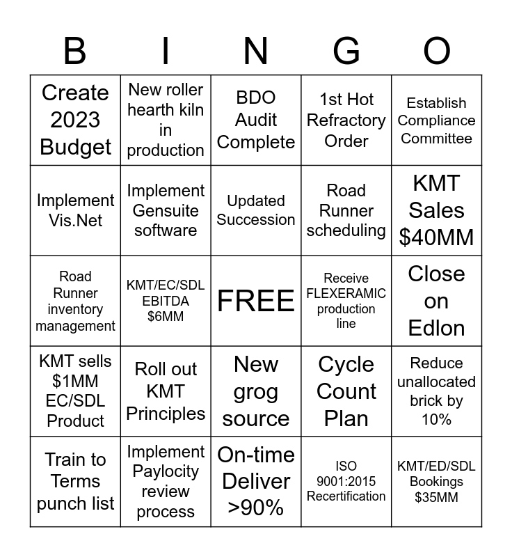This bingo card has a free space and 24 words: Roll out KMT Principles, Implement Paylocity review process, Updated Succession, Train to Terms punch list, Establish Compliance Committee, Create 2023 Budget, Implement Vis.Net, New roller hearth kiln in production, Receive FLEXERAMIC production line, New grog source, Road Runner scheduling, Road Runner inventory management, Cycle Count Plan, Reduce unallocated brick by 10%, Implement Gensuite software, ISO 9001:2015 Recertification, Close on Edlon, BDO Audit Complete, KMT Sales $40MM, KMT/EC/SDL EBITDA $6MM, KMT/ED/SDL Bookings $35MM, KMT sells $1MM EC/SDL Product, 1st Hot Refractory Order and On-time Deliver >90%.