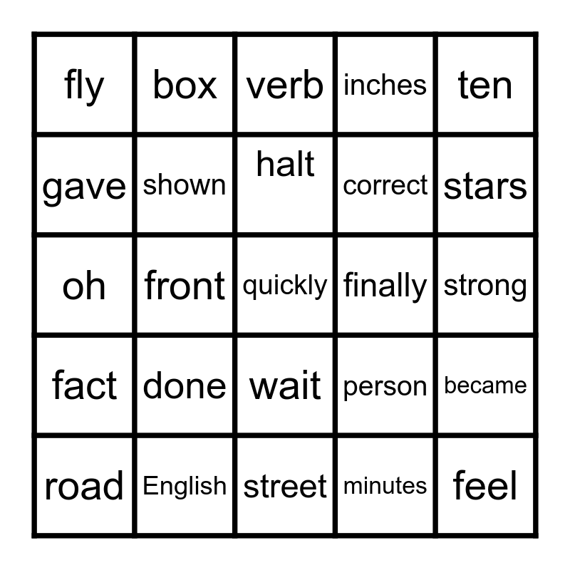 This bingo card has a free space and 24 words: done, English, halt, road, ten, fly, gave, box, finally, wait, correct, oh, person, became, shown, minutes, strong, verb, stars, front, feel, fact, inches and street.
