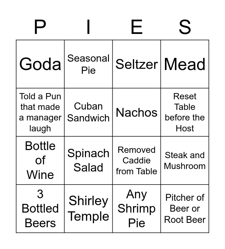 This bingo card has 16 words: Shirley Temple, Steak and Mushroom, Seltzer, Goda, Bottle of Wine, Seasonal Pie, Removed Caddie from Table, Any Shrimp Pie, Told a Pun that made a manager laugh, Cuban Sandwich, 3 Bottled Beers, Mead, Spinach Salad, Reset Table before the Host, Nachos and Pitcher of Beer or Root Beer.
