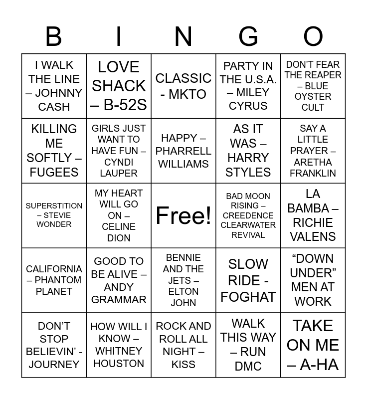 This bingo card has a free space and 82 words: WANNABE – SPICE GIRLS, SWEET CHILD O’ MINE – GUNS N’ ROSES, CLASSIC - MKTO, AIN’T NO MOUNTAIN HIGH ENOUGH – MARVIN GAYE & TAMMI TERRELL, I WANT IT THAT WAY – BACKSTREET BOYS, SMELLS LIKE TEEN SPIRIT – NIRVANA, SHAKE IT OFF – TAYLOR SWIFT, BILLIE JEAN – MICHAEL JACKSON, LOVE YOU LIKE A LOVE SONG – SELENA GOMEZ, SEPTEMBER – EARTH, WIND AND FIRE, WATERFALLS – TLC, SAY SO – DOJA CAT, GIRLS JUST WANT TO HAVE FUN – CYNDI LAUPER, BAD MOON RISING – CREEDENCE CLEARWATER REVIVAL, MMMBOP – HANSON, I WALK THE LINE – JOHNNY CASH, DON’T STOP BELIEVIN’ -JOURNEY, KILLING ME SOFTLY – FUGEES, FIREBALL - PITBULL, BABA O’RILEY – THE WHO, CHAPEL OF LOVE – THE DIXIE CUPS, AS IT WAS – HARRY STYLES, TAKE ON ME – A-HA, DON’T FEAR THE REAPER – BLUE OYSTER CULT, MY HEART WILL GO ON – CELINE DION, BACK IN BLACK – AC/DC, ALL MY EXES LIVE IN TEXAS – GEORGE STRAIT, GETTIN’ JIGGY WIT IT – WILL SMITH, MADE YOU LOOK – MEGHAN TRAINOR, UNDER PRESSURE – QUEEN/DAVID BOWIE, GOOD TO BE ALIVE – ANDY GRAMMAR, FRIENDS IN LOW PLACES – GARTH BROOKS, SUPERSTITION – STEVIE WONDER, LINGER – THE CRANBERRIES, TRUTH HURTS - LIZZO, ROCK AND ROLL ALL NIGHT – KISS, DESPACITO – LUIS FONSI & DADDY YANKEE, COUNTRY ROADS – JOHN DENVER, SAY A LITTLE PRAYER – ARETHA FRANKLIN, CAN’T STOP THE FEELING! – JUSTIN TIMBERLAKE, THE GAMBLER – KENNY ROGERS, PARTY IN THE U.S.A. – MILEY CYRUS, OYE COMO VA - SANTANA, STILL D.R.E. – DR. DRE FEAT. SNOOP DOGG, TWIST AND SHOUT – THE BEATLES, LOVE SHACK – B-52S, ACHY BREAKY HEART – BILLY RAY CYRUS, HAPPY – PHARRELL WILLIAMS, THE JOKER – STEVE MILLER BAND, SWEET CAROLINE – NEIL DIAMOND, BABY – JUSTIN BIEBER, LA BAMBA – RICHIE VALENS, HOW WILL I KNOW – WHITNEY HOUSTON, BORN IN THE USA – BRUCE SPRINGSTEEN, BLINDING LIGHTS – THE WEEKND, OASIS – WONDERWALL, BAD ROMANCE – LADY GAGA, BASKET CASE – GREEN DAY, CONGA – MIAMI SOUND MACHINE, SLOW RIDE - FOGHAT, ONLY WANNA BE WITH YOU – HOOTIE & THE BLOWFISH, CRAZY LITTLE THING CALLED LOVE – QUEEN, CALIFORNIA – PHANTOM PLANET, SHOOP – SALT-N-PEPA, BEYOND THE SEA – BOBBY DARIN, CHICKEN FRIED – ZAC BROWN BAND, LIVIN’ LA VIDA LOCA – RICKY MARTIN, WHAT MAKES YOU BEAUTIFUL – ONE DIRECTION, SWEET DREAMS (ARE MADE OF THIS) – EURYTHMICS, MR. ROBOTO – STYX, MAN! I FEEL LIKE A WOMAN – SHANIA TWAIN, JUMP AROUND – HOUSE OF PAIN, BENNIE AND THE JETS – ELTON JOHN, WALK THIS WAY – RUN DMC, LITTLE RED CORVETTE – PRINCE, CON CALMA – DADDY YANKEE, I WANT YOU BACK – THE JACKSON 5, RICH GIRL – GWEN STEFANI, DEVIL WENT DOWN TO GEORGIA – CHARLIE DANIELS BAND, TOXIC – BRITNEY SPEARS, “DOWN UNDER” MEN AT WORK and ALL NIGHT LONG – LIONEL RICHIE.