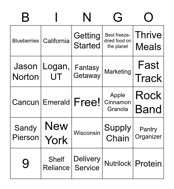 This bingo card has a free space and 35 words: Jason and Steve, Utah State, Thrive Credit, Logan, UT, Wisconsin, Best freeze-dried food on the planet, Jason Norton, Convention, Fantasy Getaway, Costa Rica, Cancun, Thrive Meals, Grilled Chicken, Strawberries, Blueberries, Apple Cinnamon Granola, Nutrilock, Emerald, Sandy Pierson, Protein, Supply Chain, 9, Pantry Organizer, Shelf Reliance, Getting Started, Fast Track, Lemonade, Mark Harvey, Marketing, Rock Band, Ambassador, Delivery Service, New York, California and American Fork, UT.
