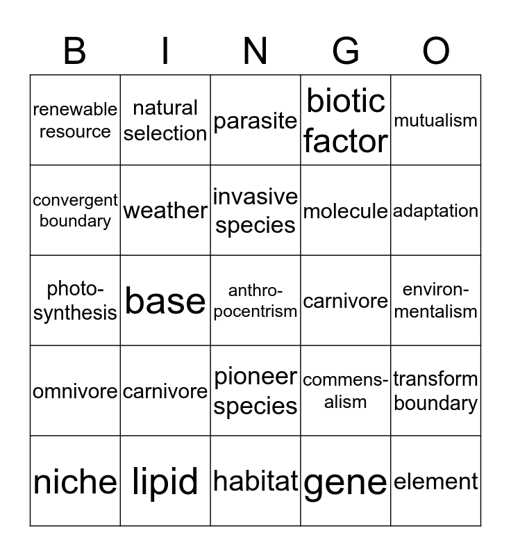 This bingo card has 25 words: carnivore, habitat, invasive species, niche, mutualism, renewable resource, convergent boundary, natural selection, carnivore, pioneer species, molecule, photo-synthesis, commens- alism, transform boundary, weather, element, environ-mentalism, parasite, adaptation, base, anthro-pocentrism, lipid, omnivore, biotic factor and gene.