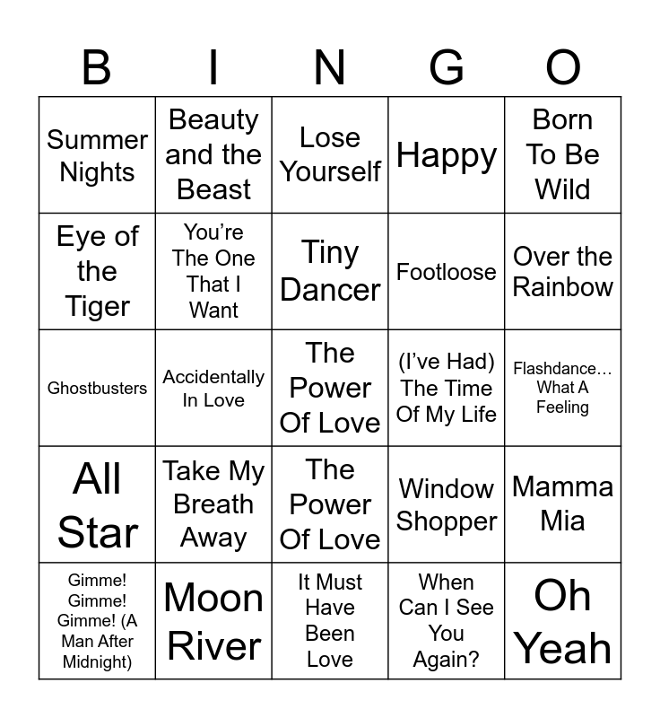 This bingo card has 35 words: 8 Mile, Kiss from a Rose, Don’t You (Forget About Me), You’re The One That I Want, The Power Of Love, Happy, Eye of the Tiger, In Your Eyes, Tiny Dancer, Bohemian Rhapsody, Ghostbusters, Born To Be Wild, Ain’t No Sunshine, Danger Zone, Summer Nights, (I’ve Had) The Time Of My Life, When Can I See You Again?, Accidentally In Love, All Star, The Power Of Love, Window Shopper, Gimme! Gimme! Gimme! (A Man After Midnight), Mamma Mia, Moon River, Lose Yourself, Over the Rainbow, Oh Yeah, Oh, Pretty Woman, Footloose, Flashdance… What A Feeling, Gangsta’s Paradise, It Must Have Been Love, Take My Breath Away, Beauty and the Beast and Theme From Shaft.