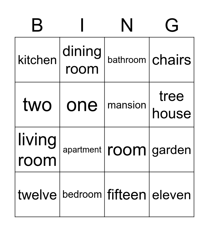 This bingo card has 16 words: bedroom, garden, bathroom, kitchen, living room, dining room, room, fifteen, two, one, twelve, chairs, apartment, tree house, mansion and eleven.