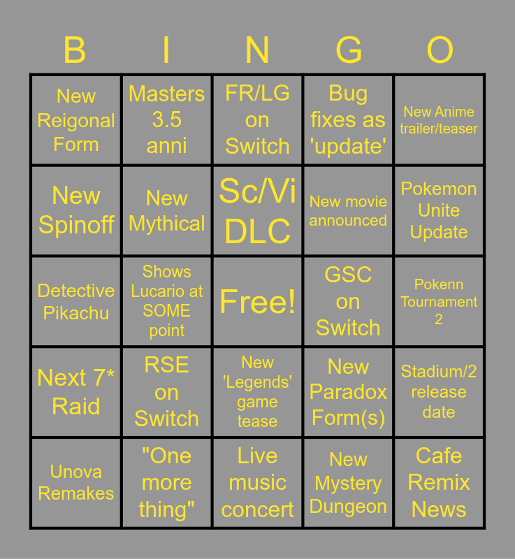 This bingo card has a free space and 24 words: RSE on Switch, "One more thing", Sc/Vi DLC, Unova Remakes, New Anime trailer/teaser, New Reigonal Form, New Spinoff, Masters 3.5 anni, GSC on Switch, New 'Legends' game tease, New movie announced, Detective Pikachu, New Paradox Form(s), Stadium/2 release date, New Mythical, New Mystery Dungeon, Pokenn Tournament 2, FR/LG on Switch, Pokemon Unite Update, Shows Lucario at SOME point, Cafe Remix News, Next 7* Raid, Bug fixes as 'update' and Live music concert.