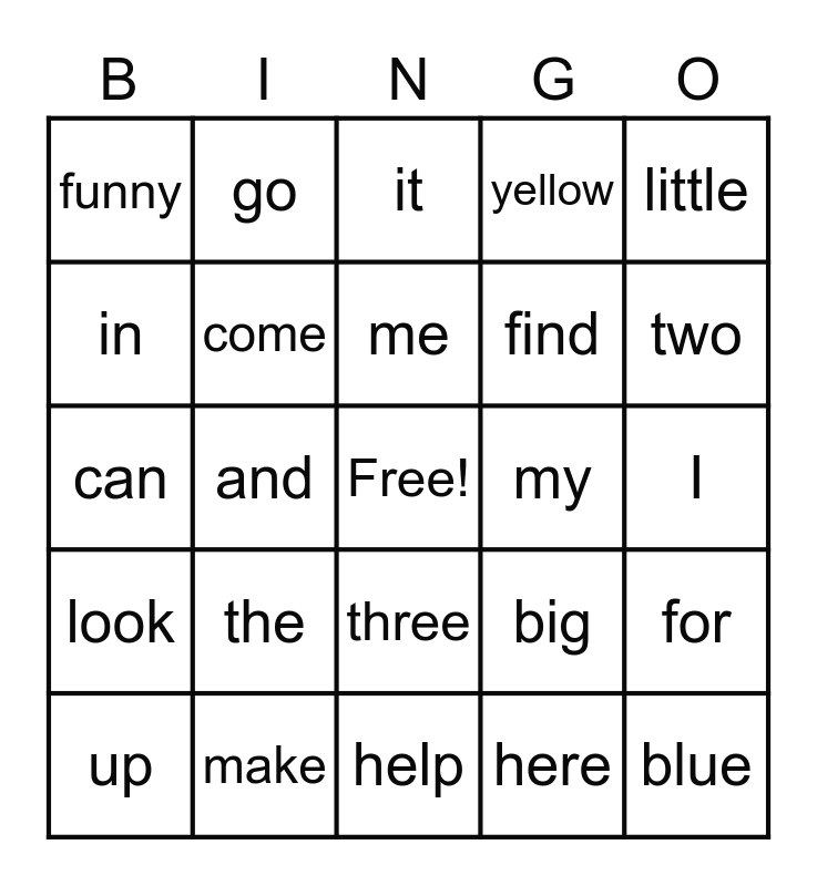 This bingo card has a free space and 40 words: a, and, away, big, blue, can, come, down, find, for, funny, go, help, here, I, in, is, it, jump, little, look, make, me, my, not, one, play, red, run, said, see, the, three, to, two, up, we, where, yellow and you.