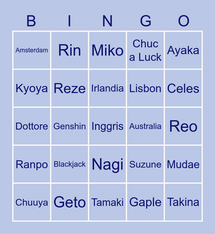 This bingo card has 25 words: Blackjack, Tamaki, Irlandia, Chuuya, Ayaka, Amsterdam, Kyoya, Rin, Australia, Nagi, Lisbon, Dottore, Suzune, Mudae, Reze, Takina, Reo, Miko, Celes, Genshin, Inggris, Geto, Ranpo, Chuc a Luck and Gaple.