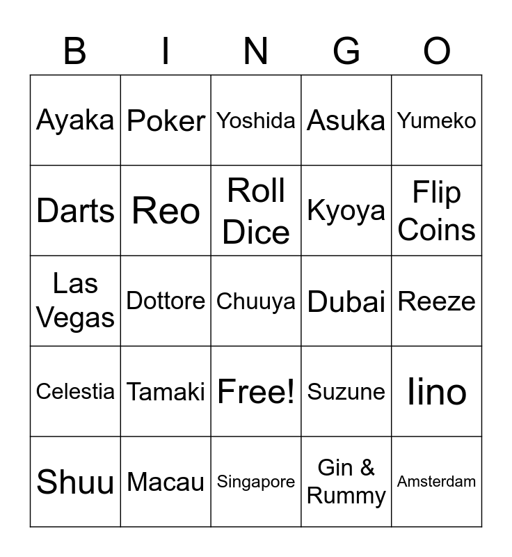 This bingo card has 26 words: Free!, Shuu, Reo, Denji, Asuka, Yumeko, Darts, Poker, Roll Dice, Gin & Rummy, Flip Coins, Las Vegas, Macau, Singapore, Dubai, Amsterdam, Ayaka, Tamaki, Yoshida, Suzune, Reeze, Celestia, Dottore, Chuuya, Kyoya and Iino.