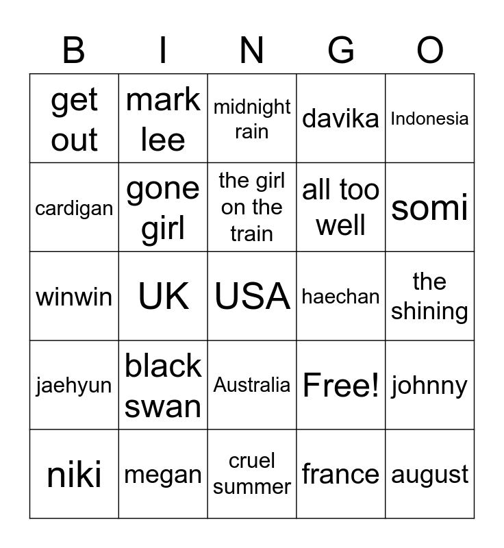This bingo card has 27 words: Free!, august, all too well, cruel summer, cardigan, midnight rain, mark lee, jaehyun, haechan, johnny, winwin, davika, niki, megan, somi, isa, gone girl, the girl on the train, black swan, get out, the shining, france, UK, USA, Australia, Indonesia and Singapore.