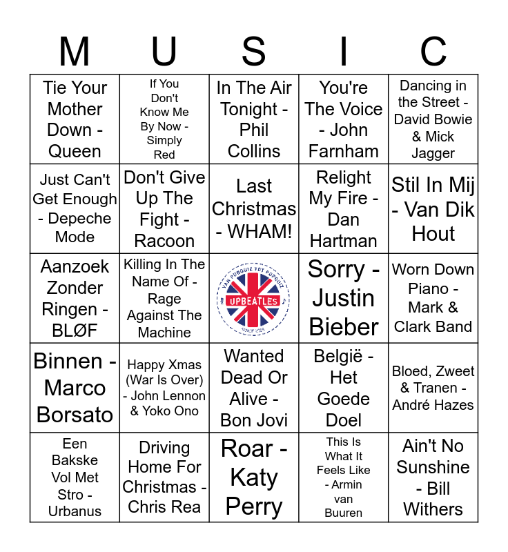 This bingo card has a free space and 24 words: Happy Xmas (War Is Over) - John Lennon & Yoko Ono, Driving Home For Christmas - Chris Rea, Last Christmas - WHAM!, Een Bakske Vol Met Stro - Urbanus, Dancing in the Street - David Bowie & Mick Jagger, Tie Your Mother Down - Queen, Just Can't Get Enough - Depeche Mode, If You Don't Know Me By Now - Simply Red, Sorry - Justin Bieber, Wanted Dead Or Alive - Bon Jovi, Relight My Fire - Dan Hartman, Aanzoek Zonder Ringen - BLØF, België - Het Goede Doel, Bloed, Zweet & Tranen - André Hazes, Don't Give Up The Fight - Racoon, This Is What It Feels Like - Armin van Buuren, Worn Down Piano - Mark & Clark Band, In The Air Tonight - Phil Collins, Stil In Mij - Van Dik Hout, Killing In The Name Of - Rage Against The Machine, Ain't No Sunshine - Bill Withers, Binnen - Marco Borsato, You're The Voice - John Farnham and Roar - Katy Perry.