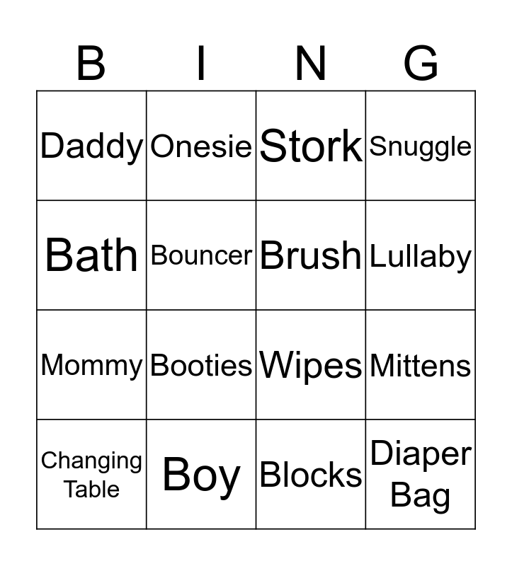 This bingo card has a free space and 15 words: Changing Table, Diaper Bag, Stork, Daddy, Lullaby, Bath, Booties, Blocks, Bouncer, Mommy, Mittens, Snuggle, Brush, Onesie and Boy.