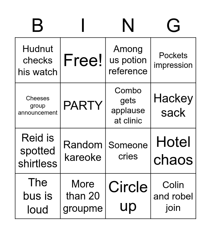 This bingo card has 19 words: Someone cries, Jordyn says fixin, Among us potion reference, Colin and robel join, Hotel chaos, Cheeses group announcement, Circle up, Hudnut checks his watch, Free!, Reid is spotted shirtless, Random kareoke, PARTY, Combo gets applause at clinic, More than 20 groupme, The bus is loud, Someone flirts with ried, Pockets impression, Hackey sack and The lights break down.