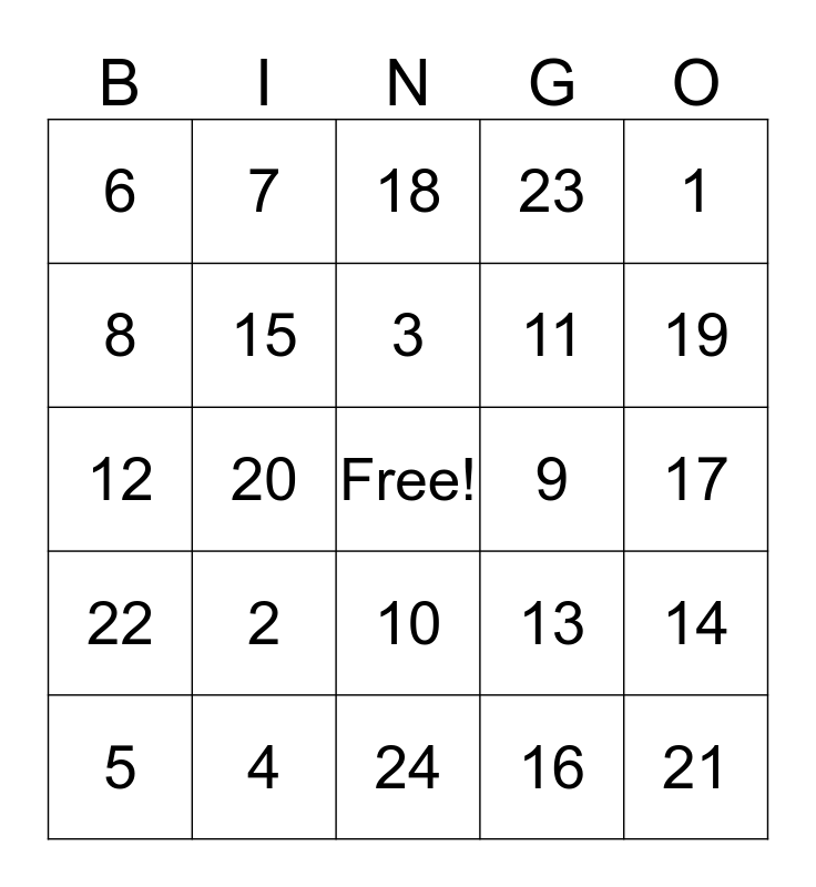 This bingo card has a free space and 24 words: 2, 4, 3, 5, 1, 6, 8, 7, 9, 10, 11, 12, 13, 14, 15, 16, 17, 18, 19, 20, 21, 22, 23 and 24.