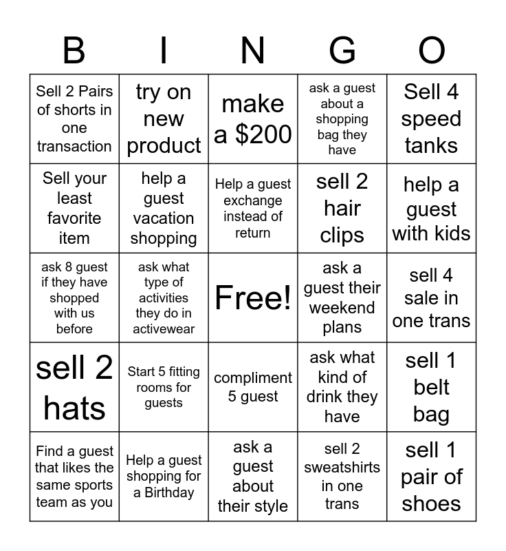 This bingo card has a free space and 24 words: Start 5 fitting rooms for guests, Help a guest shopping for a Birthday, Help a guest exchange instead of return, Find a guest that likes the same sports team as you, Sell 4 speed tanks, Sell 2 Pairs of shorts in one transaction, Sell your least favorite item, try on new product, ask a guest their weekend plans, compliment 5 guest, sell 2 hair clips, ask 8 guest if they have shopped with us before, ask what kind of drink they have, sell 1 belt bag, help a guest vacation shopping, sell 2 sweatshirts in one trans, sell 4 sale in one trans, make a $200, help a guest with kids, ask what type of activities they do in activewear, sell 1 pair of shoes, sell 2 hats, ask a guest about a shopping bag they have and ask a guest about their style.