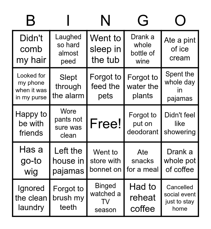 This bingo card has a free space and 24 words: Left the house in pajamas, Forgot to brush my teeth, Forgot to feed the pets, Ignored the clean laundry, Ate a pint of ice cream, Didn't comb my hair, Looked for my phone when it was in my purse, Laughed so hard almost peed, Forgot to put on deodorant, Went to store with bonnet on, Forgot to water the plants, Happy to be with friends, Ate snacks for a meal, Drank a whole pot of coffee, Slept through the alarm, Had to reheat coffee, Didn't feel like showering, Went to sleep in the tub, Spent the whole day in pajamas, Wore pants not sure was clean, Cancelled social event just to stay home, Has a go-to wig, Drank a whole bottle of wine and Binged watched a TV season.