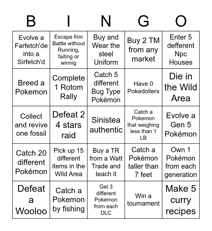 This bingo card has a free space and 24 words: Pick up 15 different items in the Wild Area, Catch a Pokemon by fishing, Catch 5 different Bug Type Pokémon, Defeat a Wooloo, Enter 5 defferent Npc Houses, Evolve a Farfetch'de into a Sirfetch'd, Breed a Pokemon, Escape frim Battle without Running, faiting or winnig, Catch a Pokemon that weighing less than 1 LB, Buy a TR from a Watt Trade and teach it, Have 0 Pokedollers, Collect and revive one fossil, Catch a Pokémon taller than 7 feet, Own 1 Pokémon from each generation, Complete 1 Rotom Rally, Win a tournament, Evolve a Gen 5 Pokémon, Buy and Wear the steel Uniform, Die in the Wild Area, Defeat 2 4 stars raid, Make 5 curry recipes, Catch 20 different Pokémon, Buy 2 TM from any market and Get 3 different Pokémon from each DLC.