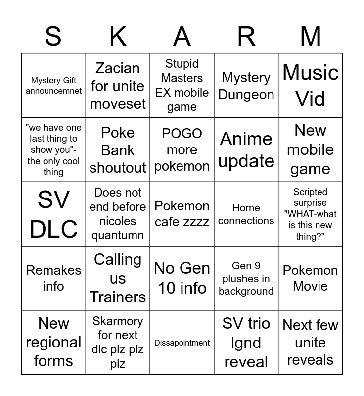 This bingo card has a free space and 24 words: Calling us Trainers, Skarmory for next dlc plz plz plz, POGO more pokemon, New regional forms, Music Vid, Mystery Gift announcemnet, "we have one last thing to show you"-the only cool thing, Zacian for unite moveset, Home connections, No Gen 10 info, Anime update, SV DLC, Gen 9 plushes in background, Pokemon Movie, Poke Bank shoutout, SV trio lgnd reveal, Scripted surprise "WHAT-what is this new thing?", Stupid Masters EX mobile game, New mobile game, Does not end before nicoles quantumn, Next few unite reveals, Remakes info, Mystery Dungeon and Dissapointment.